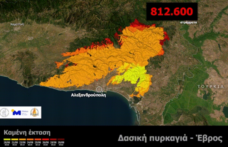 Вкупната површина изгорена од шумскиот пожар кај Еврос, заклучно со вчера напладне е 81.260 хектари, од кои околу 65.000 хектари изгореле за само три дена, во период од 21 до 23 август.