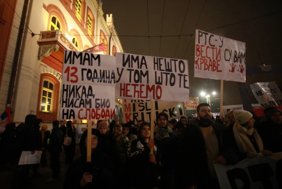 Студенти и граѓани се собраа вечерва пред зградата на Радио телевизија на Србија (РТС)на протест под слоганот „Наше право да знаеме се“.