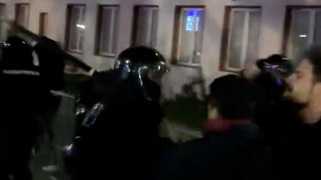 На видео снимката се гледа како жандармеријата во опрема за немири тепа студенти собрани зад зградата на РТС, кои се обиделе да ја спречат полицијата да влезе во зградата.