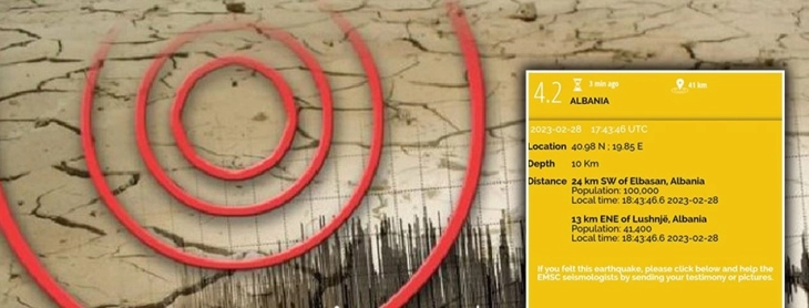 Земјотрес со јачина од 4,1 степен според рихтеровата скала вечерва, во 18:43 часот е регистриран во централна Албанија.