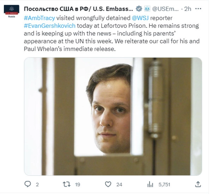 Амбасадорката на САД во Русија Лин Трејси денеска го посети новинарот на Волстрит џурнал Еван Гершкович во московски затвор, соопшти Амбасадата, додека тој се подготвува да поднесе нова жалба следната недела против неговиот истражен притвор поради обвинение за шпионажа.
