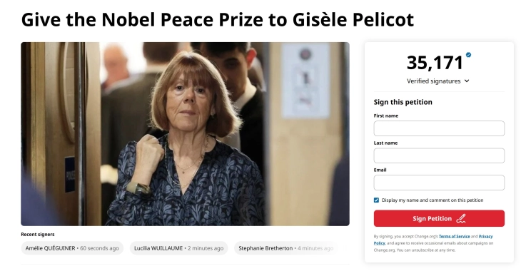Кетрин Мејер, британска активистка, започна петиција за Французинката Жизел Пелико, која била жртва на сексуално насилство, да биде номинирана за Нобелова награда за мир. Петицијата веќе има повеќе од 35.000 потписи на англиски и француски јазик.