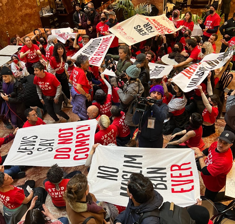 Демонстрациите беа организирани од „Еврејскиот глас за мир“, прогресивна еврејска антиционистичка група, која го објави своето „масовно одбивање“ на притворот на Калил. Демонстрантите носеа натписи на кои пишуваше „БОРЕТЕ СЕ СО НАЦИСТИТЕ НЕ СО СТУДЕНТИТЕ“. Најмалку 150 луѓе учествуваа во протестот, според NYPD, и беа извршени неколку апсења, иако властите не го прецизираа бројот. Заменик градоначалникот за јавна безбедност потврди дека нема повредени и дека сите демонстранти се отстранети од зградата.