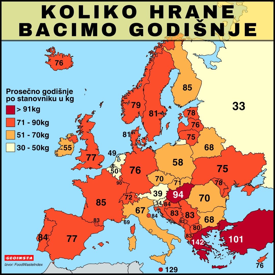 Во Европа, најголемо фрлање храна е регистрирано во Грција – дури 142 килограми по жител годишно. Од друга страна, најрационално со храната располагаат Русија и Словенија, каде што се фрлаат само 33, односно 34 килограми по жител.