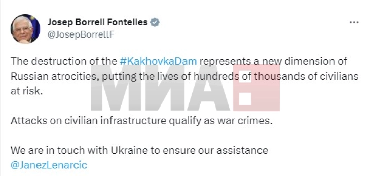 Високиот претставник на ЕУ за надворешна политика и безбедност, Жозсеп Борел, изјави дека Русија со уништувањето на браната на хидроелектраната Каховка на југот на Украина, ја подигна својата агресија против Украина на друго ниво.