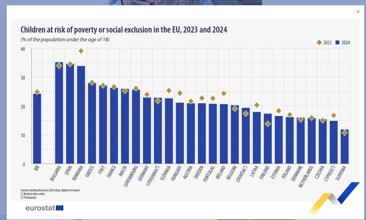 Во 2024 година, 19,5 милиони деца во Европската Унија биле изложени на ризик од сиромаштија или социјална исклученост. Оваа бројка претставува 24,2 проценти од децата под 18 години, што е намалување за 0,6 процентни поени од 2023 година (24,8%), објави Евростат.