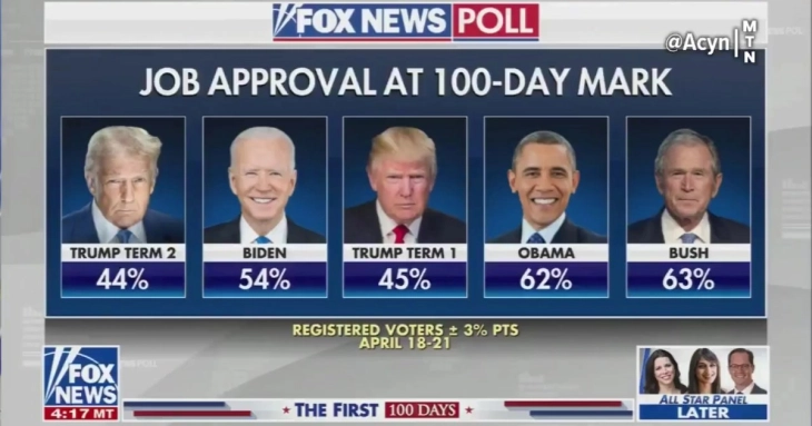 „Фокс Њуз“, исто така, истакнува дека популарноста на Трамп е помала дури и во споредба со неговата прва администрација, кога тој имаше 45 отсто поддршка на 100-тиот ден од неговиот мандат.