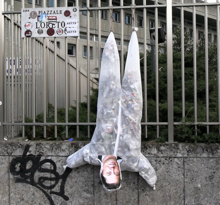Импровизирана кукла полна со ѓубре со ликот на Илон Маск обесена наопаку вчера беше пронајдена на плоштадот Лорето во Милано, на истото место каде во 1945 година беше изложено телото на италијанскиот фашистички лидер Бенито Мусолини.
