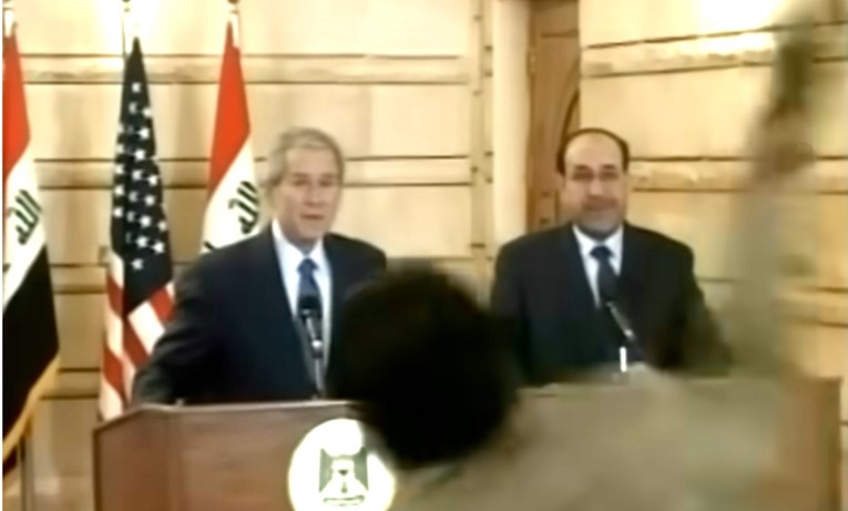 Ирачкиот новинар Мунтадар ал-Заиди ненадејно станал, извикал на арапски: „Ова е проштален бакнеж од ирачкиот народ, кучиња!“ и кон Буш ги фрлил двата чевли. Американскиот претседател инстинктивно се наведнал и успеал да ги избегне ударите, додека обезбедувањето веднаш го совладало напаѓачот. Никој не бил повреден, а прес-конференцијата била брзо прекината.