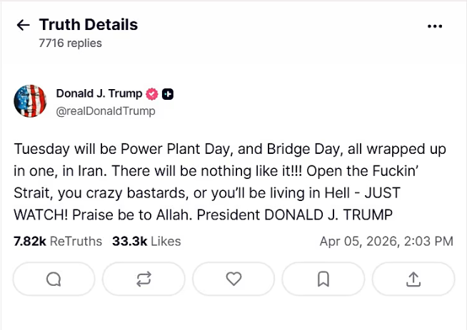 „Вторник ќе биде Ден на електраната и Ден на мостот, сè заедно, во Иран“, напиша тој. „Нема да има ништо слично!!! Отворете го ебениот теснец, луди копилиња, или ќе живеете во пекол – САМО ГЛЕДАЈТЕ!“