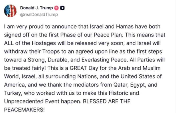 Израел и милитантната палестинска организација Хамас се договорија за првата фаза од мировниот план за Газа на американскиот претседател Доналд Трамп, објави Трамп на Truth Social. – Ова значи дека сите заложници ќе бидат ослободени многу скоро, а Израел ќе ги повлече своите трупи до договорената линија како прв чекор кон силен, траен и вечен … Продолжи со читање Израел и Хамас се договорија за првата фаза од мировниот план на Трамп за Газа