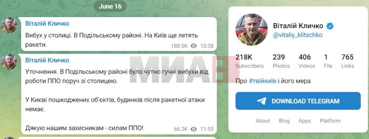 Претходно Кличко информира дека има експлозии во централниот регион Подолск. Тој на „Телеграм“ напиша дека нема оштетувања на објекти и згради во Киев.
