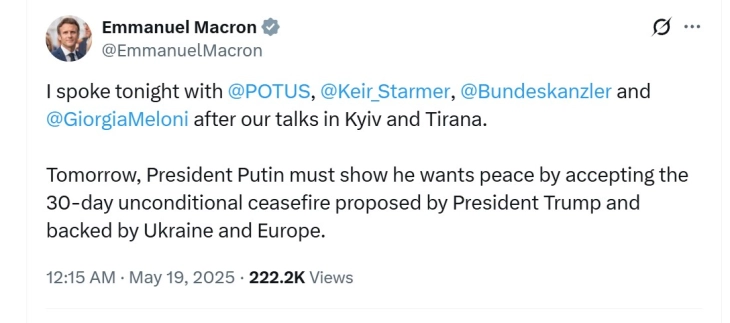 - Претседателот Путин утре треба да докаже дека навистина сака мир и да го прифати безусловниот 30-дневен прекин на огнот предложен од претседателот Трамп, а поддржан од Украина и Европа, напиша францускиот претседател Емануел Макрон на X.