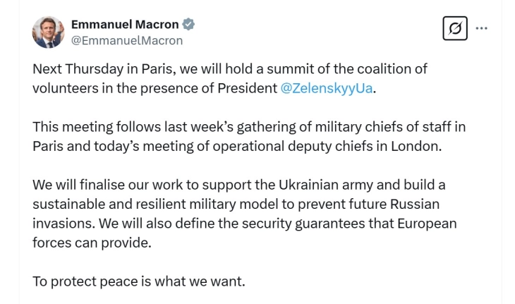 Францускиот претседател Емануел Макрон најави нов самит на земји кои се подготвени да помогнат во гарантирањето на евентуалниот мировен договор меѓу Украина и Русија.