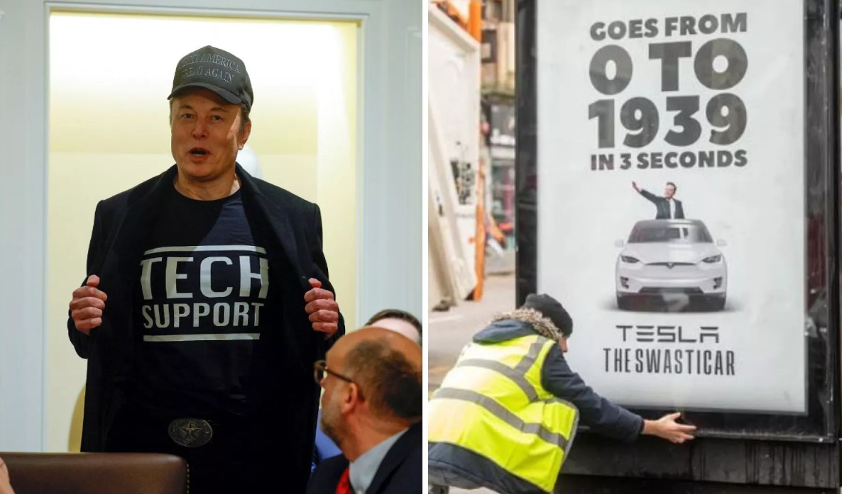 Постерот го прикажува автомобилот Тесла преименуван во „Свастикар“, со слика на технолошкиот милијардер кој го прави својот озлогласен нацистички поздрав од инаугурацијата на Доналд Трамп во јануари.