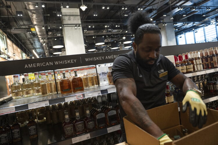 Сликите обезбедени од ЛЦБО во вторникот наутро покажуваат како работници отстрануваат шишиња американско виски и вино од полиците на продавниците.