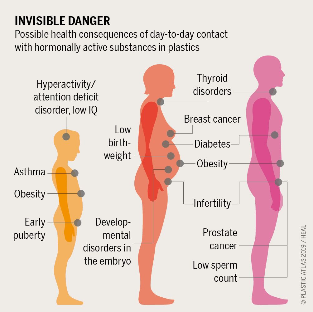 Анализата покажала дека фетусите, доенчињата и малите деца се многу подложни на штетите поврзани со пластиката, а изложеноста е поврзана со зголемен ризик од спонтан абортус, предвремено раѓање и мртвородено дете, вродени дефекти, нарушен раст на белите дробови, рак кај децата и проблеми со плодноста подоцна во животот. Пластичниот отпад често се разградува на микро и нано пластика која влегува во човечкото тело преку вода, храна и дишење. Честичките се пронајдени во крвта, мозокот, мајчиното млеко, плацентите, спермата и коскената срцевина. Нивното влијание врз здравјето на луѓето е во голема мера непознато досега, но тие се поврзани со мозочни удари и срцеви удари, а истражувачите рекле дека е потребен претпазлив пристап.