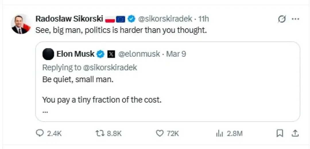 Во една од низата објави на платформата „Икс“, Маск му одговори на Шикорски со зборовите: „Молчи, мали човеку“.