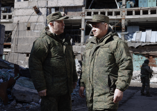 На видео објавено од Министерството, може да се види како Шојгу доделува медали на руски воен персонал и го обиколува уништениот град заедно со окружниот командант, генерал-полковник Рустам Мурадов. Високи руски воени команданти ретко ја посетуваат линијата на фронтот во Украина откако Русија ја нападна земјата пред една година.