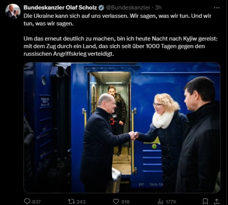 • Сакам да биде јасно дека Германија ќе остане најсилниот поддржувач на Украина во Европа, изјави Шолц, кој допатува до Киев со специјален воз.