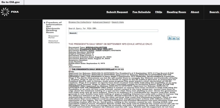 Стејт департментот викендов соопшти за декласификација на дневните брифинзи подготвени за претседателот Ричар Никсон од 9 и 11 септември 1973 година поврзани со државниот удар во Чиле.
