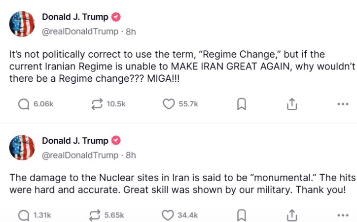 „Не е политички коректно да се користи терминот „промена на режимот“, но ако сегашниот ирански режим не е во состојба повторно да го направи Иран голем, зошто да не се случи промена на режимот?“ МИГА!“, напиша Трамп на својот профил на мрежата Truth Social, користејќи го акронимот MIGA за „Make Iran Great Again“, како алузија на акронимот MAGA, или „Make America Great Again“, што беше слоганот на претседателските кампањи на Трамп.