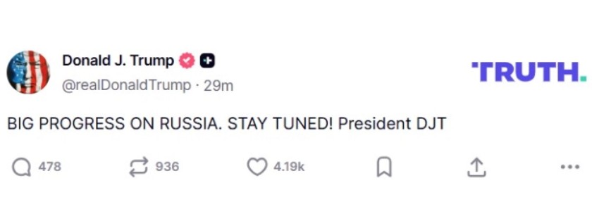 „ГОЛЕМ НАПРЕДОК ЗА РУСИЈА. СЛЕДЕТЕ! Претседател ДЈТ“, напиша Трамп.