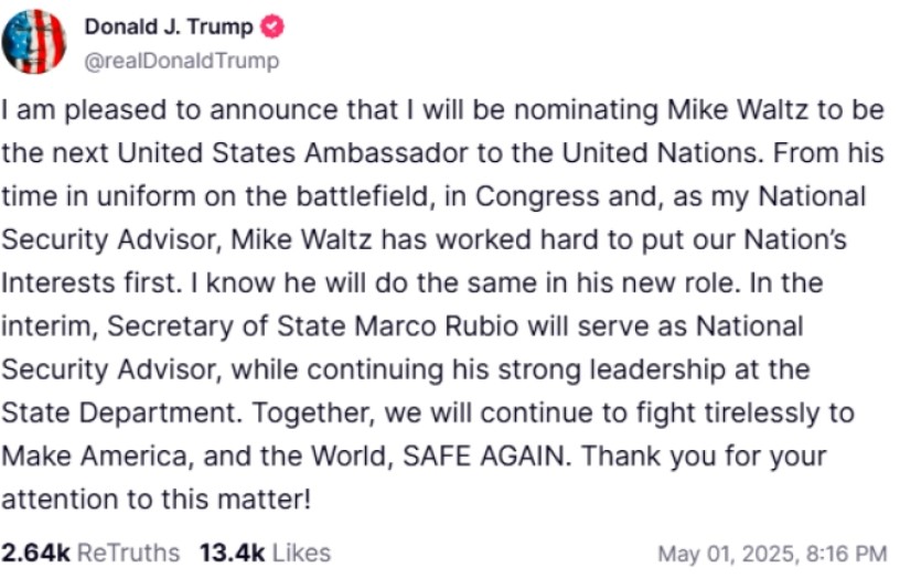 „Мајк Волц работеше напорно за да ги стави интересите на нашата нација на прво место. Знам дека ќе го стори истото и на својата нова улога“, објави Трамп на Truth Social. Државниот секретар Марко Рубио сега ќе биде и „привремен“ советник за национална безбедност, наведе Трамп.