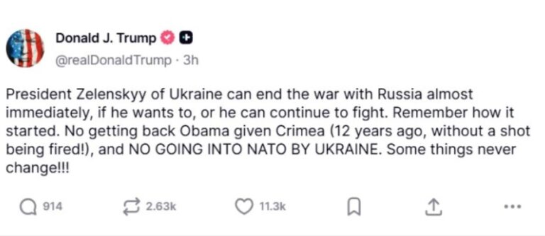 Американскиот претседател Доналд Трамп синоќа изјави дека украинскиот претседател Володимир Зеленски „може да ја заврши војната со Русија речиси веднаш“, отфрлајќи ја идејата Украина да се приклучи на НАТО и да го врати Кримскиот полуостров анектиран од Русија како нереална. На својата платформа Truth Social, Трамп рече дека Зеленски „може да ја заврши војната со … Продолжи со читање Трамп: Зеленски би можел да ја заврши војната со Русија речиси веднаш