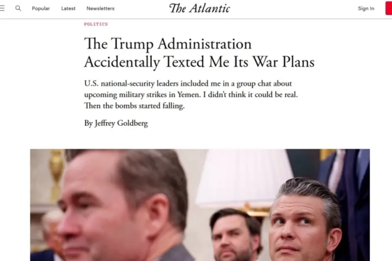 Членови на Советот за национална безбедност на САД користеле апликацијата „Сигнал“ („Signal“) за дискусии поврзани со воена операција против јеменските Хути, при што во затворената група се нашол и Џефри Голдберг, главен уредник на „Атлантик“.