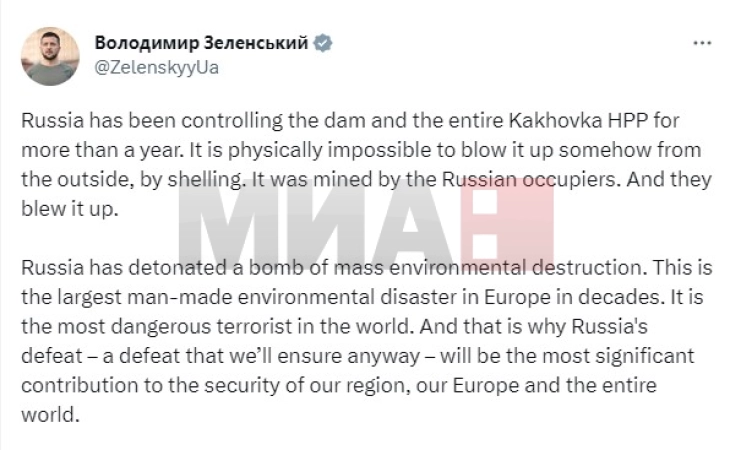 – Ова е најголемата еколошка катастрофа предизвикана од човек во Европа во последните неколку децении. Тоа е најопасниот терорист во светот. И затоа поразот на Русија – пораз што ќе го обезбедиме – ќе биде најважниот придонес за безбедноста на нашиот регион, на нашата Европа и на целиот свет, додаде Зеленски.