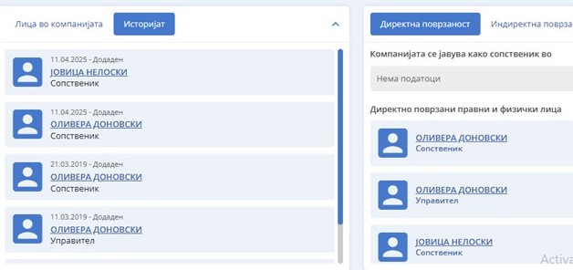 По доаѓањето на власт на ВМРО, или точно на 11.04.2025 година, како содружник во фирмата ѝ се приклучува Јовица Нелоски.