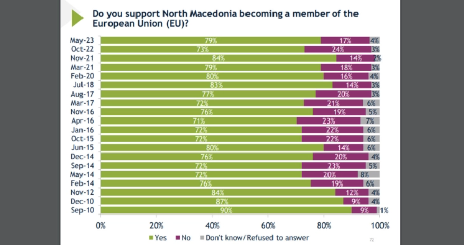 Како што се наведува во соопштението, на прашањето дали ја поддржуваат интеграцијата на земјата во Европската Унија, 79 отсто од возрасните испитаници одговориле со „да“, што претставува раст од шест процентни поени во однос на анкетата извршена минатиот октомври.