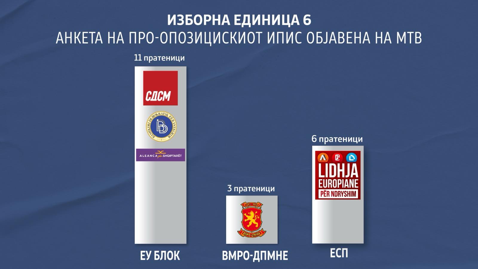 Вчера на МТВ беше објавен вториот дел од анкетата на Институтот за политички истражувања – Скопје на анлитичарот Владимир Божиновски, кој покажува дека Европскиот фронт би освоил 11 пратенички места во шестата изборна единица, пред ВМРО-ДПМНЕ кои би освоиле само 3.