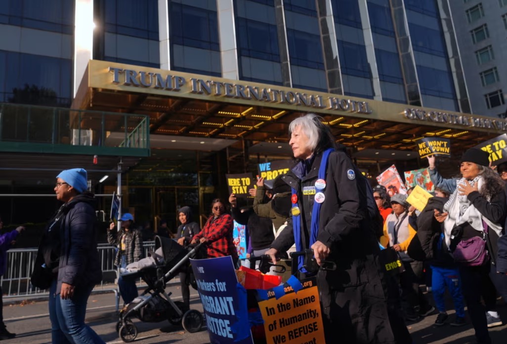 Во Њујорк во саботата, демонстрантите од групите за застапување фокусирани на правата на работниците и правдата на имигрантите се преполни пред меѓународниот хотел и кулата Трамп на 5-та авенија, држејќи знаци на кои пишуваше: „Заштитете ја нашата иднина“ и „Господине претседателе, колку долго треба да чекаат жените слобода?“ Други држеа табли на кои пишуваше: „Нема да отстапиме“ додека скандираа: „Еве сме и не заминуваме!“