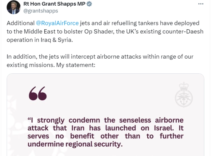 Авионите на британското кралско воздухопловство на Блискиот Исток „доколку има потреба ќе пресретнат какви било воздушни напади во опсегот на нашите постоечки мисии“, соопшти британското Министерство за одбрана.