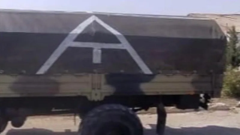Фото: Симболот ∀ на воено возило на азербејџанската армија, кое се движи кон границата со Ерменија