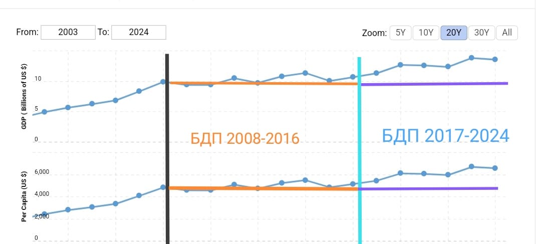 За разлика од тоа, од 2008 до 2016 година, за време на владеењето на режимот на ВМРО-ДПМНЕ, Брутодомашниот производ на земјата е во едно исто рамниште, со неколку растови, но и последователни падови.