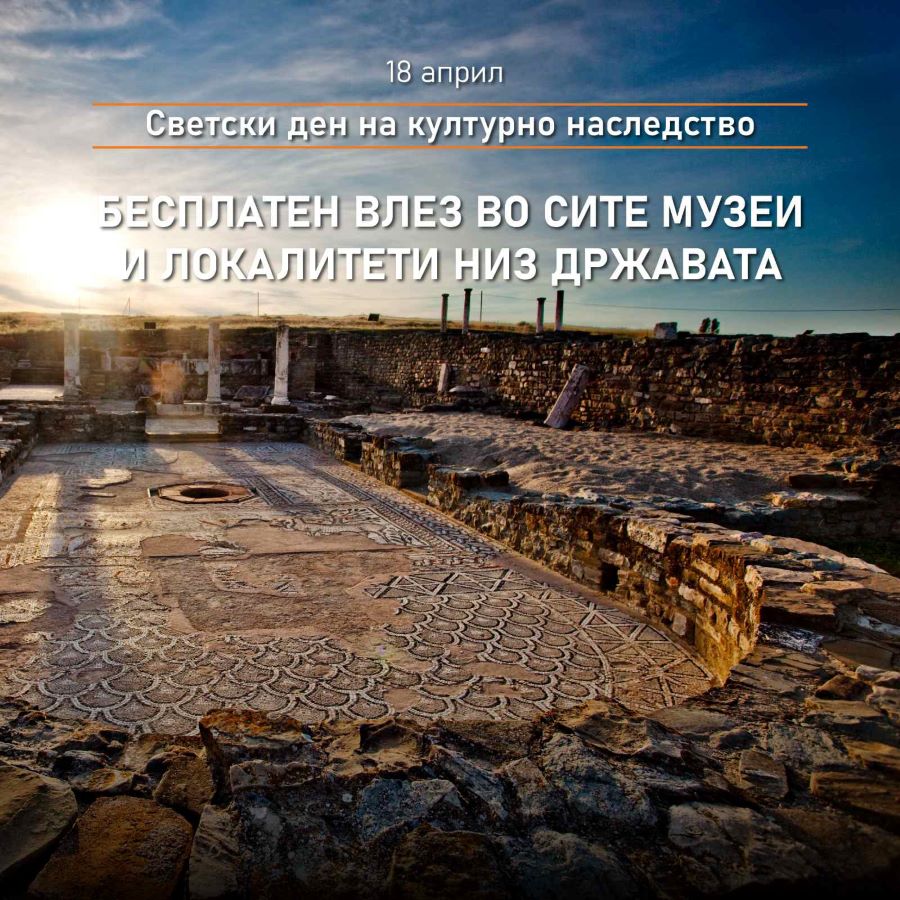 По повод 18 Април, Светскиот ден на спомениците и археолошките локалитети, утре ќе биде овозможен слободен влез во сите национални установи од областа на заштитата на културното наследство, кои ќе бидат отворени во текот на целиот ден, со што граѓаните ќе имаат можност да се запознаат со археолошките локалитети и спомениците низ државава.