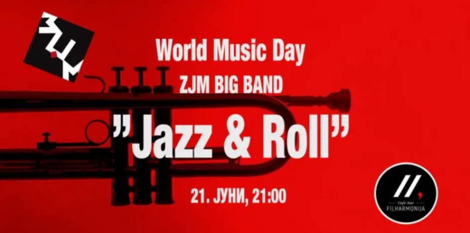 Во среда, 21 јуни, со почеток од 21 часот, Биг Бендот на Здружението на џез музичари и слободни уметници – ЗЏМ Скопје, ќе одржи целовечерен концерт насловен “Jazz & Roll,” на платото пред Филхармонија Кафе Бар.