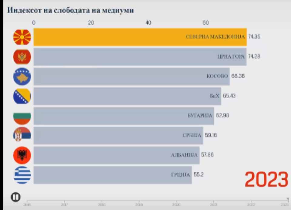 Според организацијата на Репортери без граници, Македонија има постигнато извонреден резултат, рангирана е на 38 место во светот во Индексот за слобода на медиумите за 2023 година.