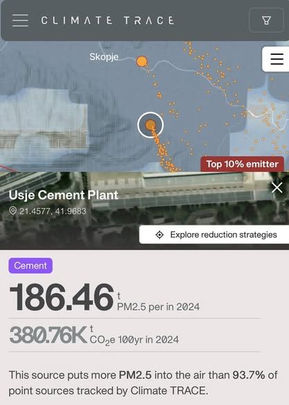 „Според податоците на меѓународната платформа Climate TRACE, Цементара Титан Усје е идентификувана како еден од најголемите извори на загадување со ПМ2.5 честици, рангирана меѓу првите 10% емитери на ГЛОБАЛНО ниво. ПМ2.5 честиците се меѓу најопасните за здравјето, при што предизвикуваат сериозни срцеви и белодробни заболувања, особено кај децата, повозрасните и хронично болните“, напиша Арсовска на фб.