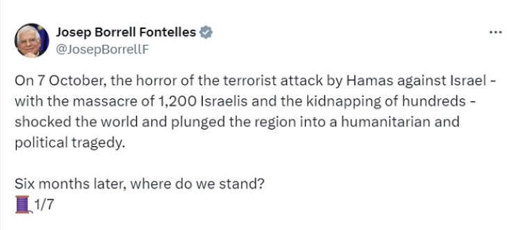 -Ужасот од терористичкиот напад на Хамас врз Израел, со масакрот врз 1.200 Израелци и киднапирањето на стотици други, го шокираше светот и го втурна регионот во хуманитарна и политичка трагедија. Каде стоиме шест месеци подоцна?, наведе Борел во објава на Икс.