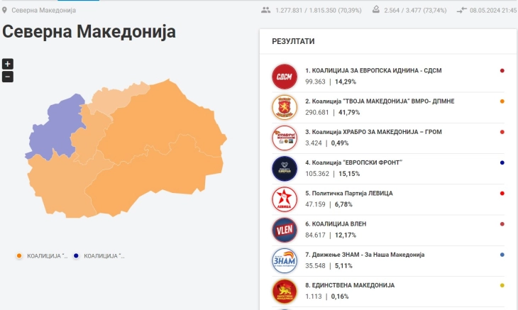 Првичните резултати од денешните парламентарни избори што Државната изборна комисија ги објавува на својата веб-страница, покажуваат дека од обработени 73,74 избирачките места, Коалицијата „Твоја Македонија“ на ВМРО-ДПМНЕ има освоено 290.681 (41,79%), Европски фронт на ДУИ 105.362 (15,15%), Коалицијата за европска иднина предводена од СДСМ 99.363 (14,29%), а Коалицијата од албанскиот опозициски блок „Вреди“ 84.617 (12,17%).