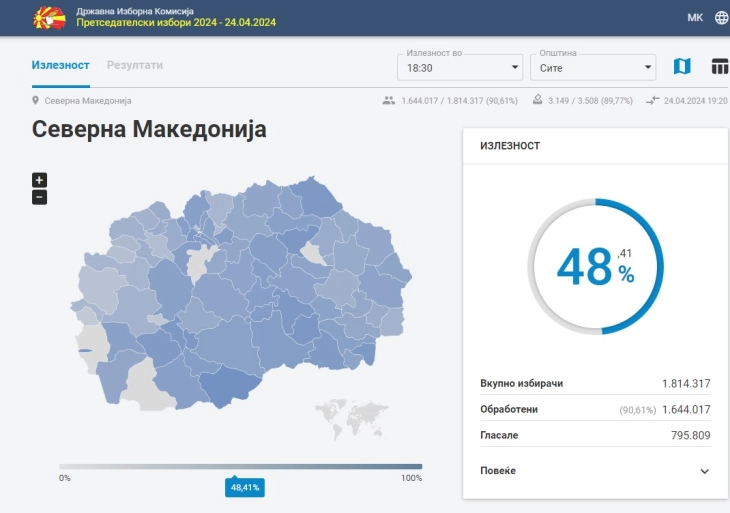 Одѕивот на претседателските избори до 18 часот изнесуваше 47,61отсто, и е поголем од последните избори за шеф на државата во 2019 година кога до 19 часот на гласање излегоа вкупно 41,67 отсто од запишаните избирачи.