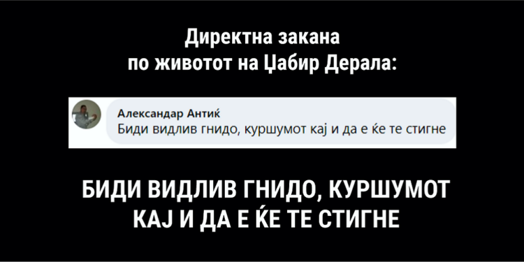 Директна закана со убиство денеска му беше упатена на Џабир Дерала. Во коментар на неговата колумна „Снајперисти со врзани очи“, од профилот „Александар Антиќ“ беше напишан коментарот: