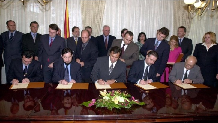 Охридскиот рамковен договор беше потпишан на 13 август 2001 година во претседателската резиденција на Водно во Скопје од страна на тогашниот претседател на државата Борис Трајковски, тогашниот премиер и лидер на ВМРО-ДПМНЕ, Љубчо Георгиевски, како и тогашните лидери на СДСМ, Бранко Црвенковски, на ПДП, Имер Имери и на ДПА, Арбен Џафери. Свои потписи на договорот ставија и специјалните претставници на ЕУ и на САД, Франсоа Леотар и Џејмс Пердју. Во разговорите што започнаа во јули во Скопје, а потоа продолжија во Охрид, беа консултирани повеќе советници и експерти.
