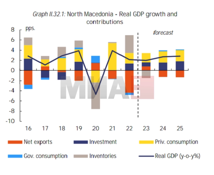 По закрепнување од ковид пандемијата, економскиот раст на Северна Македонија забави како резултат на намалената надворешна побарувачка и на поумерената потрошувачка на домаќинствата, но се очекува негово умерено забрзување во следниот период, со дополнително ублажување на инфлацијата, раст на платите и дознаките од странство, предвидува Европската комисија во своите есенски економски прогнози.