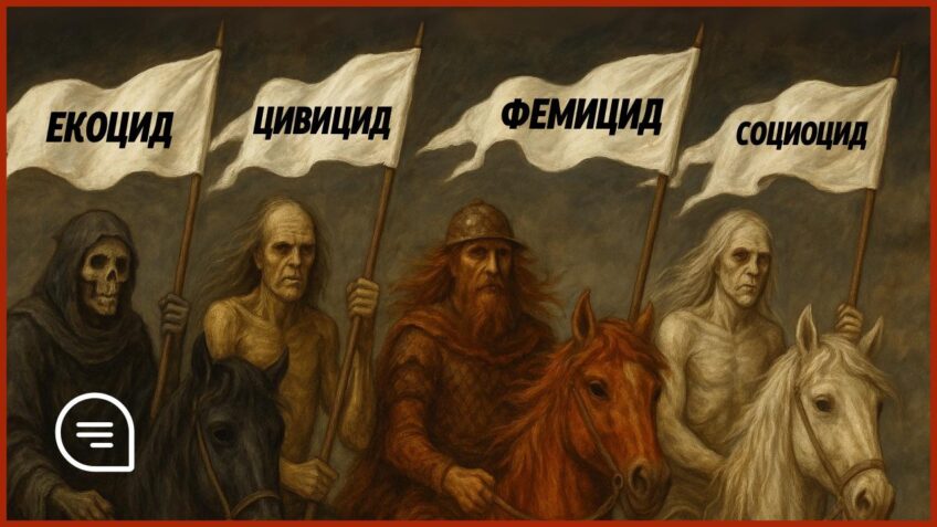 Македонија е соочена со мултидимензионална криза која се состои од екоцид, фемицид, социоцид, и системска неправда што се надополнува со легицид и јуридицид. Борбата против овие „цидови“ е од клучна важност за спасување на државата и општеството од колапс. Македонија се наоѓа на крстопат на големи предизвици кои ја доведуваат во прашање не само сегашноста, … Продолжи со читање Екоцид, Фемицид, Социоцид – Јавачи на Апокалипсата во Македонија
