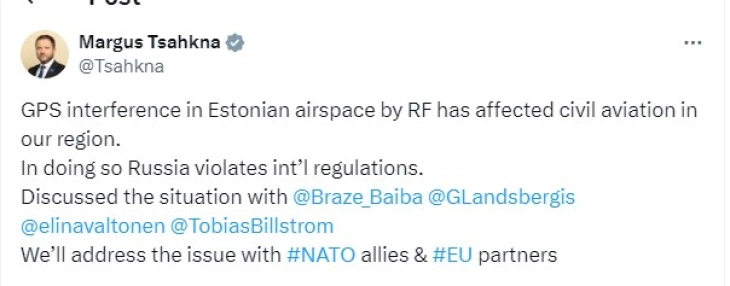 Естонскиот министер за надворешни работи Маргус Цакна ја обвини Русија за кршење на меѓународните прописи со попречување на ЏПС сигналите во естонскиот воздушен простор.